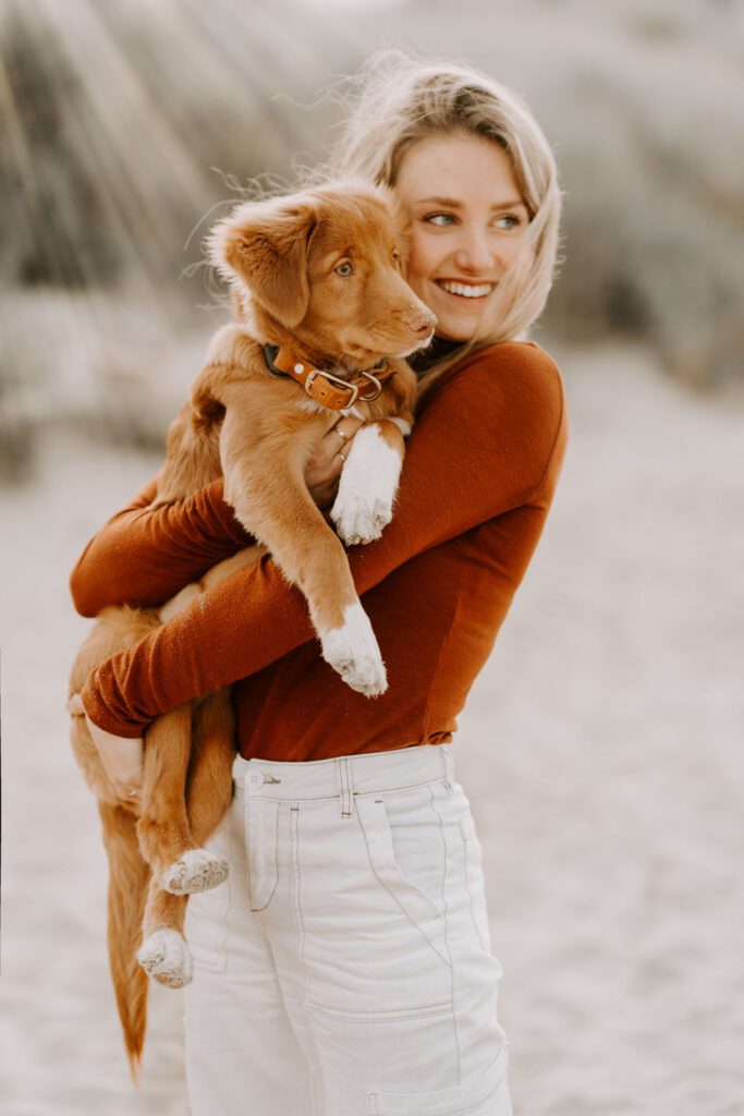 Outdoor-Welpenfotografie: Die Outdoor-Welpenfotografie besticht durch natürliches Licht und die Schönheit der Natur. Besonders schön ist das Licht zum Sonnenuntergang, was jedoch die Zeit etwas begrenzt. Outdoor lassen sich dynamische und lebendige Aufnahmen realisieren. Allerdings können die vielen Reize in der Natur die Aufmerksamkeit eures Welpen schnell ablenken, was es schwieriger macht, ruhige und konzentrierte Momente einzufangen. Ein schlafender Welpe auf dem Arm – das passiert hier eher selten.