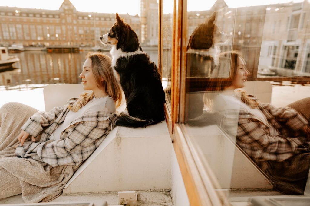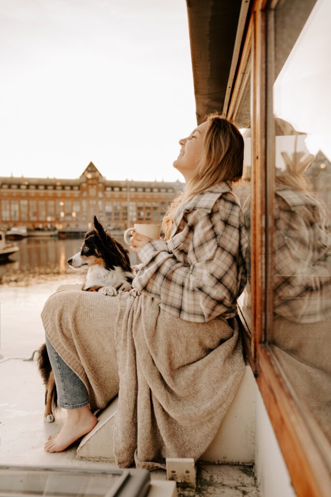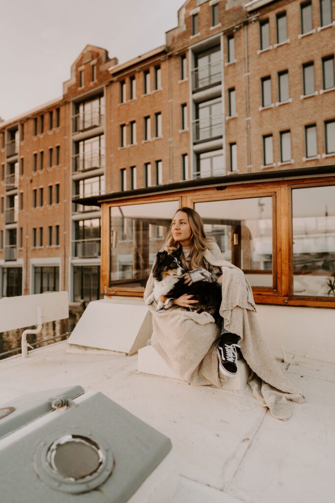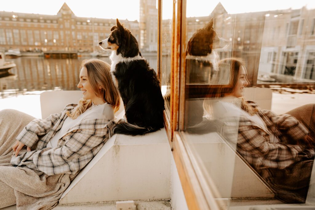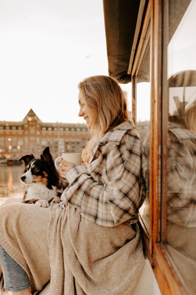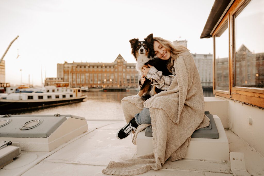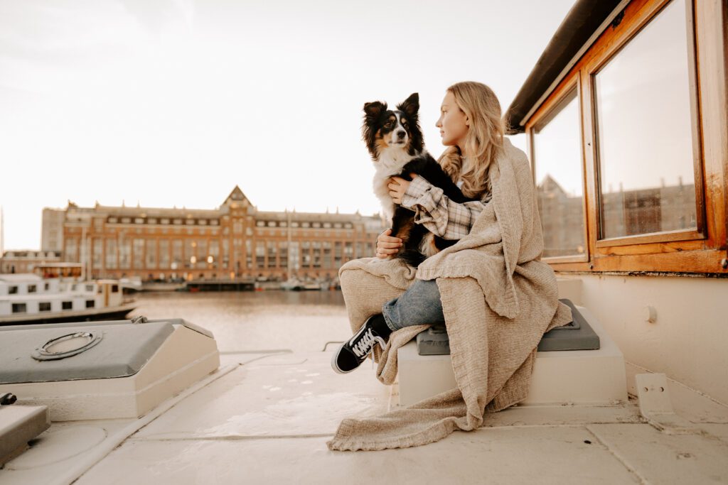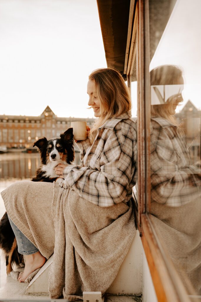 Zusammen mit Petfluencer Hündin Skye von beshepherdandbeloved vier Tage nach Amsterdam aufs Hausboot und soviel Fotos wie möglich machen? Mal im Ernst, welche Hundefotografin hätte da nicht direkt HIER gerufen. Denn wenn ich eines liebe, dann ist es die Fotografie. Und so schön ich unser kleines Saarland finde, überregional arbeiten zu dürfen war und ist einfach mein Traum. Als Hundebesitzerin kommen für mich kürzere Trips eher in Frage, blutet mein Hundemama Herz einfach zu sehr Mylo länger alleine zu lassen. In vier Tagen schafft man eine bunte Mischung aus guten und abwechslungsreichen Fotos, leckerem Instafood und etwas Shopping (den Sightseeing Part lassen wir meistens aus). Zwischen Laura und mir stimmt die Chemie. Uns verbindet nicht nur die Passion zum Beruf und die Liebe zum Hund, auch unser ganzer Lifestyle und unsere Einstellung zum Leben sind sehr ähnlich. Wir schätzen gutes Essen, geben beide gerne Geld aus und genießen das Leben so gut es eben geht. Man könnte auch sagen, wir verbinden immer das Nützliche mit dem Schönen. So auch bei Fotospot Nummer eins, dem Hausboot. Eine Unterkunft, die nicht nur typisch Amsterdam ist, sondern auch für Fotos taugt, besser geht wohl nicht. Und bereits am Ankunftstag war klar, hier kann ich meiner Kreativität freien Lauf lassen. Die Ideen zu meinen Shootings kommen mir meist bei Autofahrten. Dieses mal kam sie mir aber beim Kaffee trinken am Morgen. Ich beobachtete den Lauf der Sonne, schaute mit dem Kompass nach wie sie verlief und hatte sie in meinem Kopf, die Bilder für eine Fellfreundschaft in Amsterdam. Eine Tasse Kaffee am Morgen, eingekuschelt in eine Decke und den eingekuschelt mit Hund den Sonnenaufgang beobachten, so die Theorie.