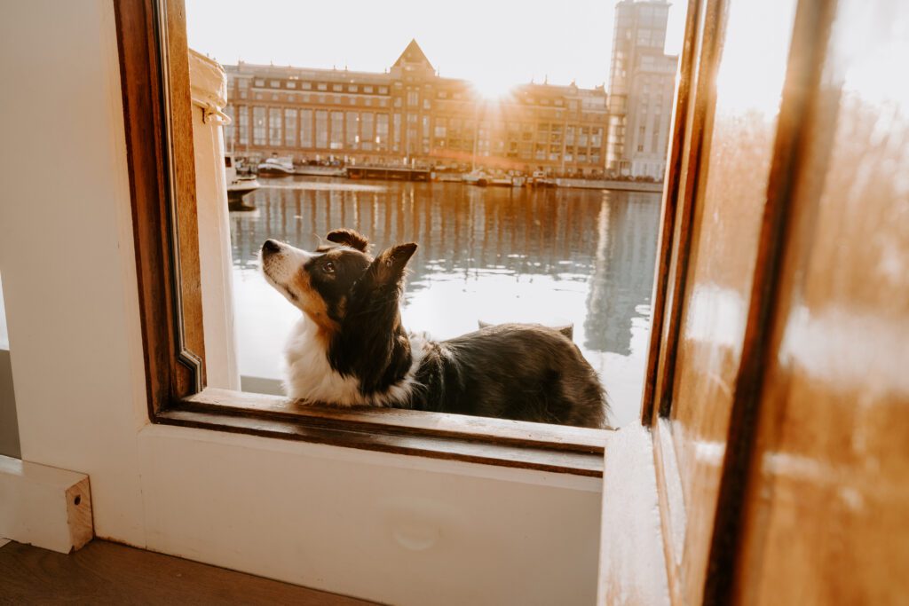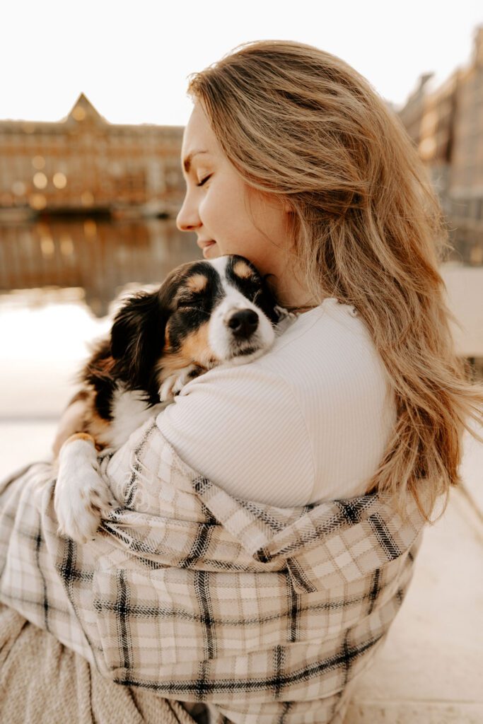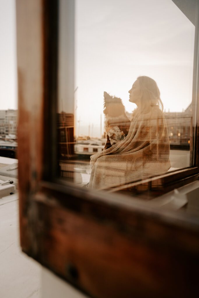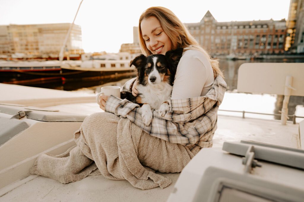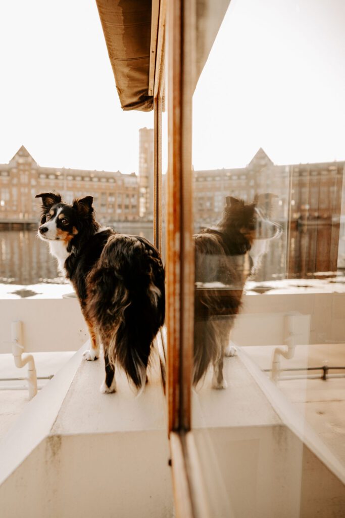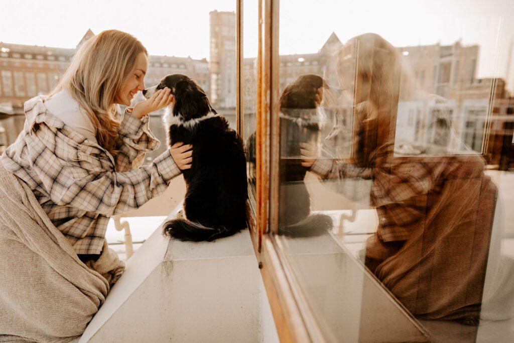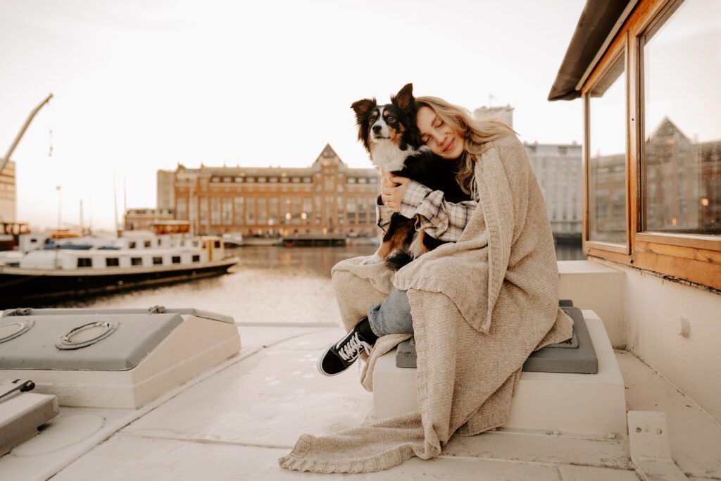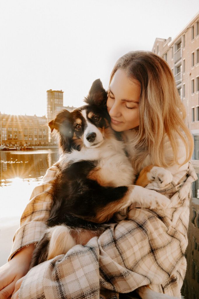 Zusammen mit Petfluencer Hündin Skye von beshepherdandbeloved vier Tage nach Amsterdam aufs Hausboot und soviel Fotos wie möglich machen? Mal im Ernst, welche Hundefotografin hätte da nicht direkt HIER gerufen. Denn wenn ich eines liebe, dann ist es die Fotografie. Und so schön ich unser kleines Saarland finde, überregional arbeiten zu dürfen war und ist einfach mein Traum. Als Hundebesitzerin kommen für mich kürzere Trips eher in Frage, blutet mein Hundemama Herz einfach zu sehr Mylo länger alleine zu lassen. In vier Tagen schafft man eine bunte Mischung aus guten und abwechslungsreichen Fotos, leckerem Instafood und etwas Shopping (den Sightseeing Part lassen wir meistens aus). Zwischen Laura und mir stimmt die Chemie. Uns verbindet nicht nur die Passion zum Beruf und die Liebe zum Hund, auch unser ganzer Lifestyle und unsere Einstellung zum Leben sind sehr ähnlich. Wir schätzen gutes Essen, geben beide gerne Geld aus und genießen das Leben so gut es eben geht. Man könnte auch sagen, wir verbinden immer das Nützliche mit dem Schönen. So auch bei Fotospot Nummer eins, dem Hausboot. Eine Unterkunft, die nicht nur typisch Amsterdam ist, sondern auch für Fotos taugt, besser geht wohl nicht. Und bereits am Ankunftstag war klar, hier kann ich meiner Kreativität freien Lauf lassen. Die Ideen zu meinen Shootings kommen mir meist bei Autofahrten. Dieses mal kam sie mir aber beim Kaffee trinken am Morgen. Ich beobachtete den Lauf der Sonne, schaute mit dem Kompass nach wie sie verlief und hatte sie in meinem Kopf, die Bilder für eine Fellfreundschaft in Amsterdam. Eine Tasse Kaffee am Morgen, eingekuschelt in eine Decke und den eingekuschelt mit Hund den Sonnenaufgang beobachten, so die Theorie.
